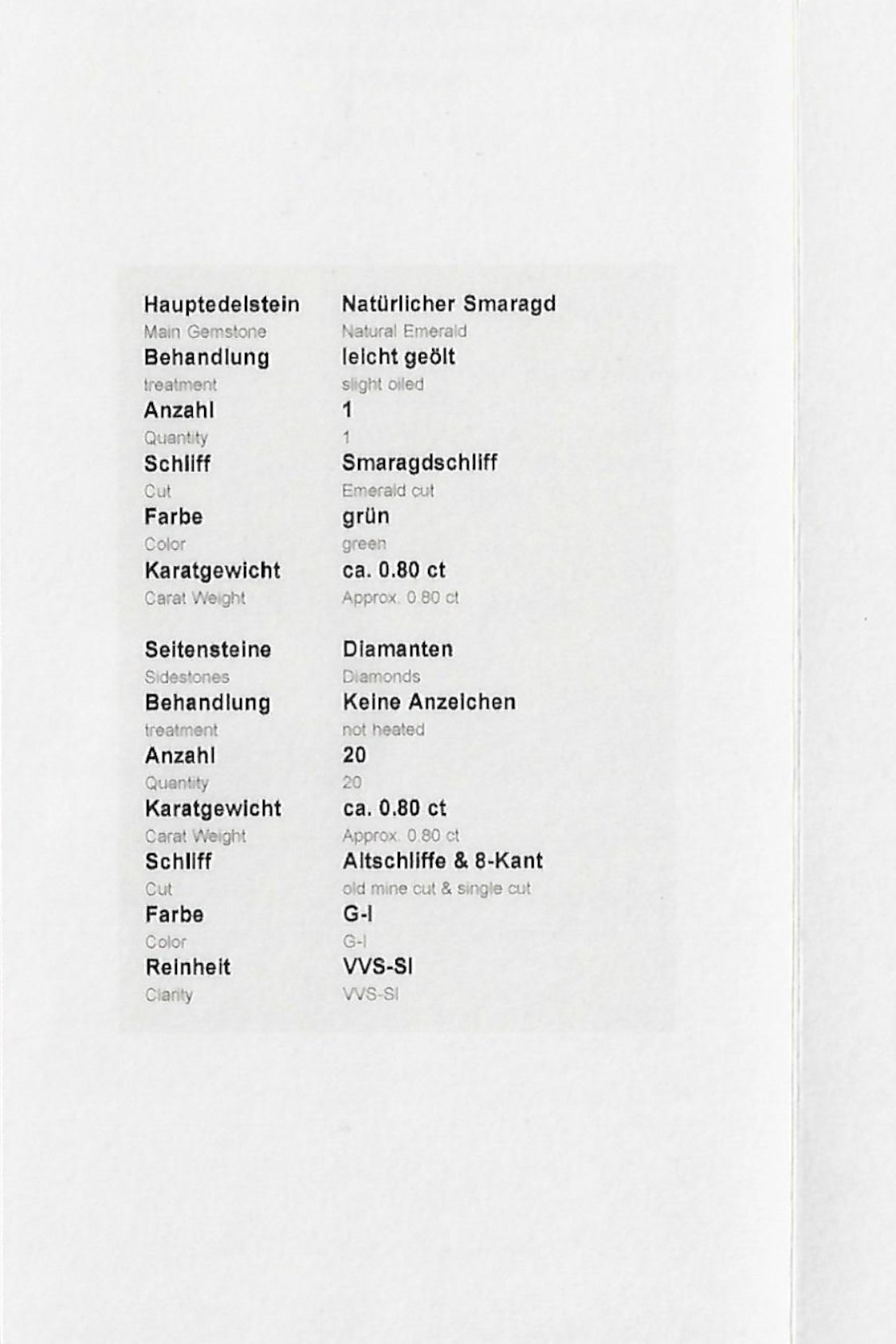 Ein gemmologisches Zertifikat über die Edelsteine liegt vor und wird beim Kauf überreicht. Die Edelsteine sind folgendermaßen bewertet: