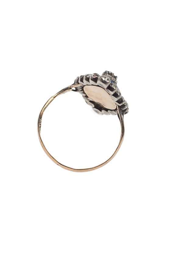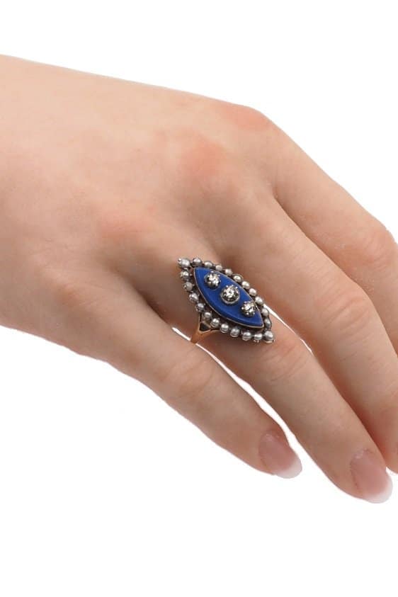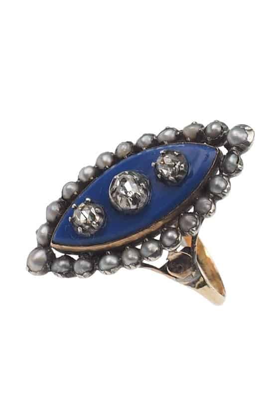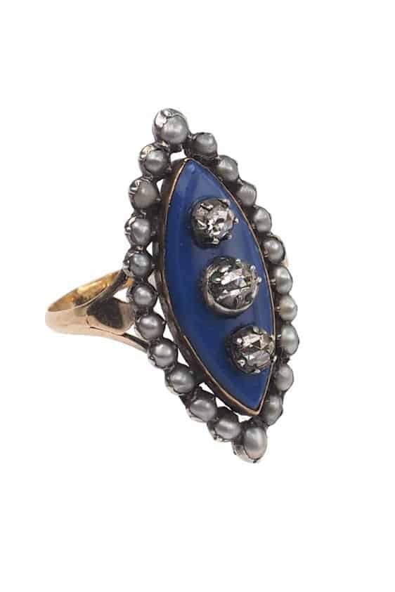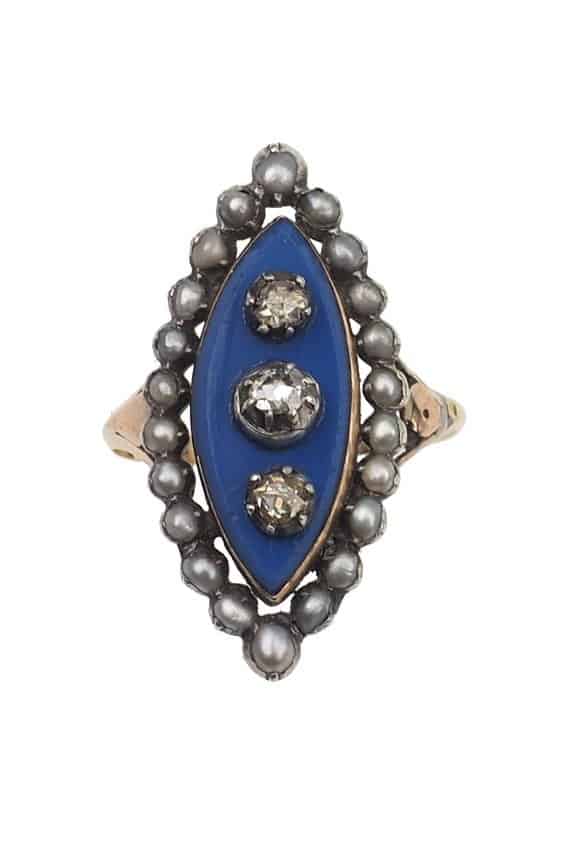 Home » Shop » Um 1800 – 18 ct. Gold Georgian Ring mit blauem Glas, 3 Altschliffdiamanten & Naturperlen, aus Frankreich