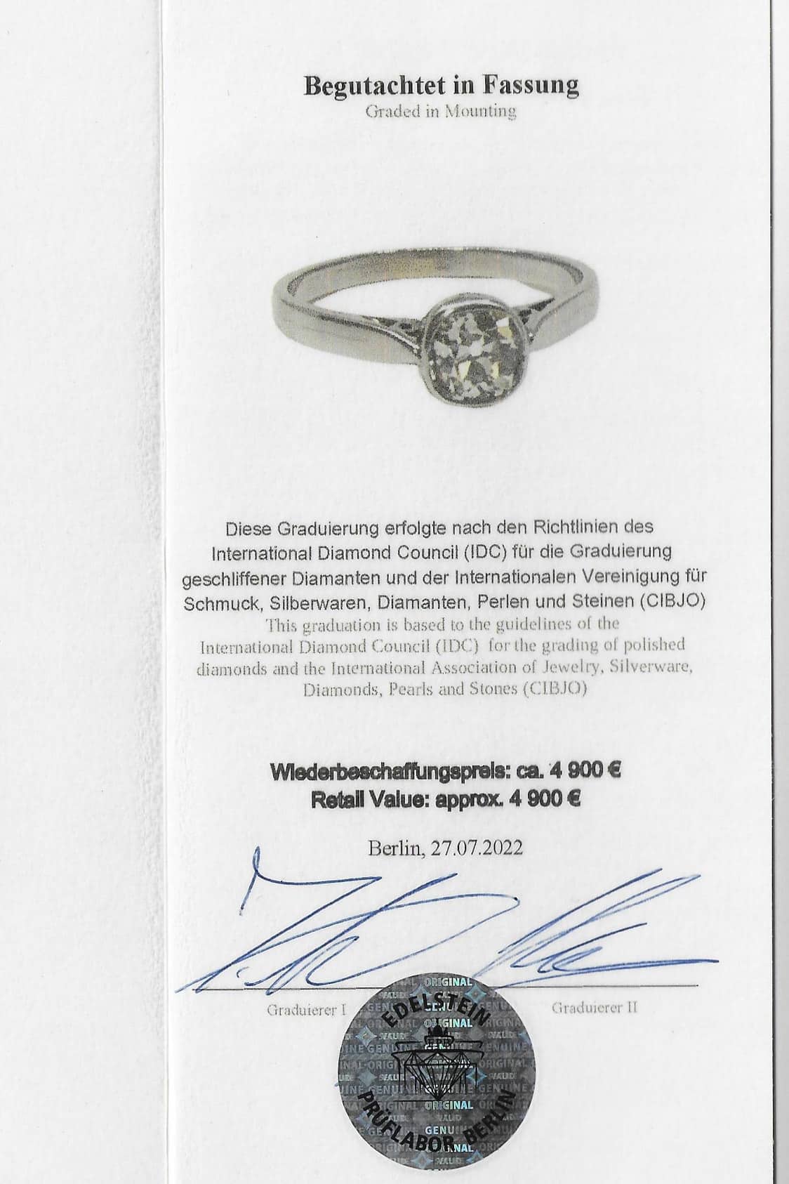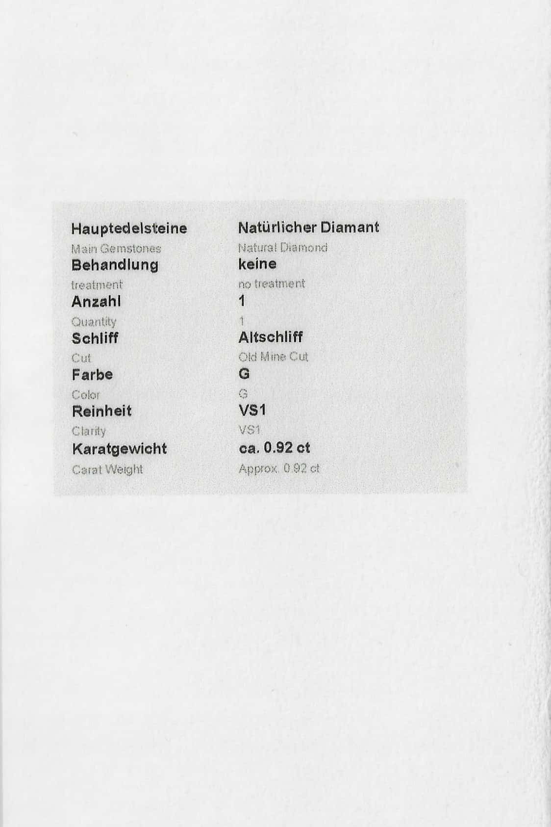 Ein gemmologisches Zertifikat über den Edelstein liegt vor und wird beim Kauf überreicht. Der Diamant ist folgendermaßen bewertet:
