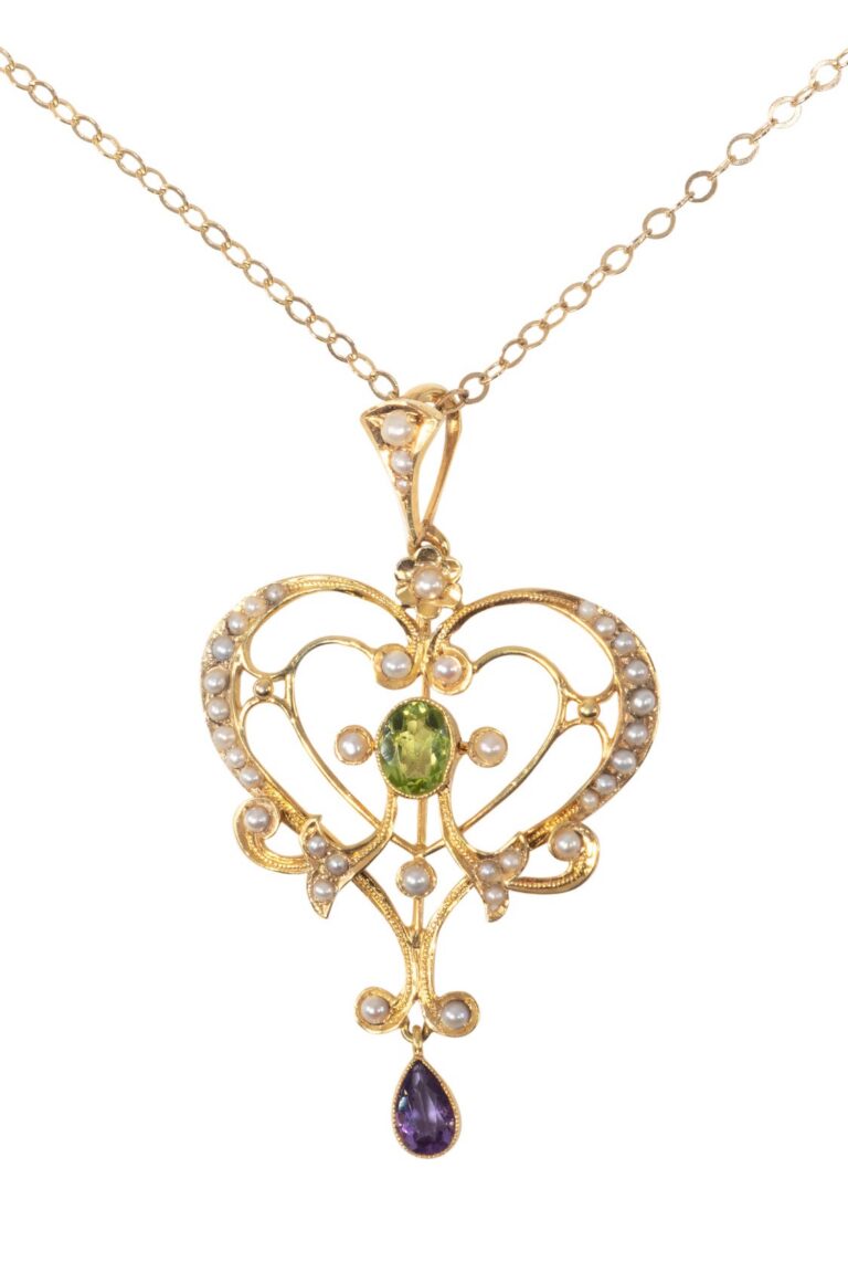 Ab dem Jugendstil und seiner englischen Parallelepoche, dem Edwardian, erreichten die Kreationen der Gold- und Platinschmiede neue Höhen. Platin war als weißes Edelmetall der Stunde ein wahrer Glücksfall: In Platin gefasste Diamanten und Farbedelsteine erstrahlten so hell wie nie zuvor. Die Colliers und Kettenanhänger dieser Zeit wurden aufwendig und fantasievoll gestaltet, wobei der Bezug zur Natur bei Jugendstil-Ketten fast schon obligatorisch war. Die Einbindung von strahlend weißen Diamanten in Kombination mit Peridots, Rubinen, Smaragden, Amethysten oder Citrinen wirkte schlicht betörend.