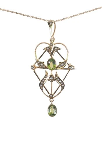 Um 1900 – 18 ct. Gold Anhänger/Brosche mit Kette Diamanten & Peridots England