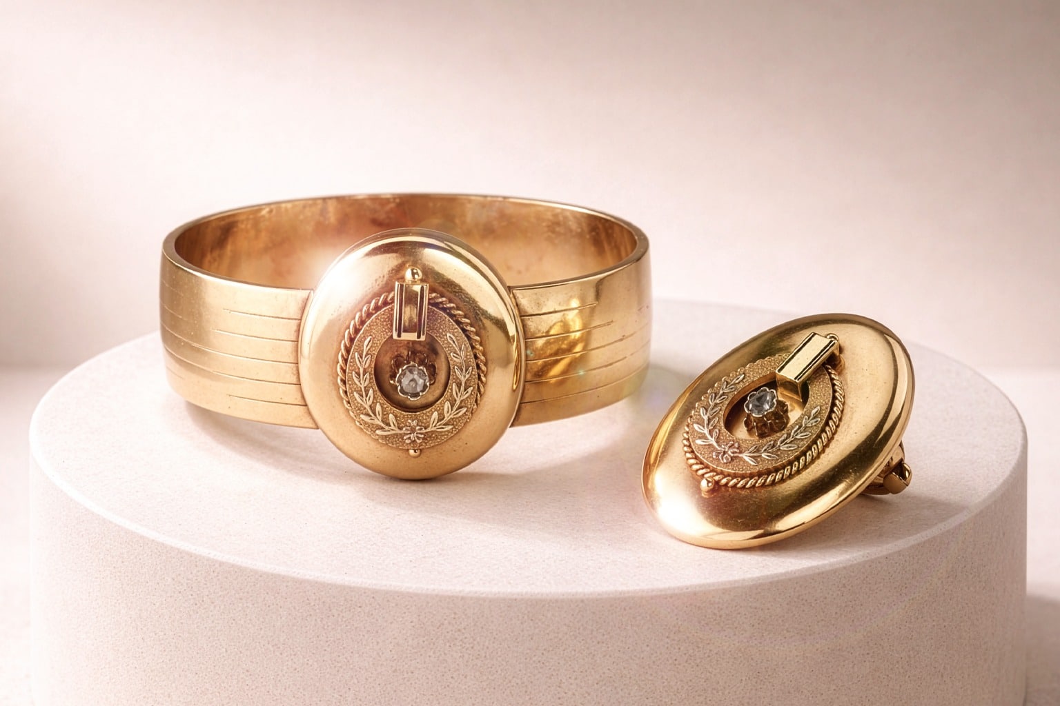 Um 1860 – 18 ct. Gold Set aus Armreif & Medaillon