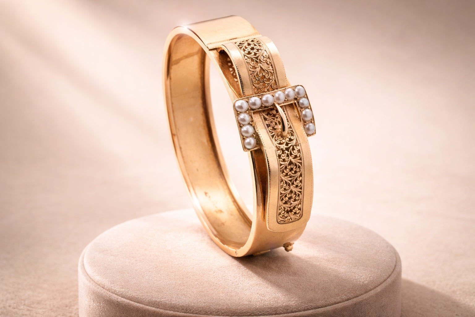 Um 1870 – 18K Goldarmreif mit Handgravur & Naturperlen