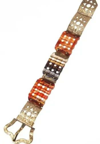 Sehr verbreitet war in der viktorianischen Epoche der schottische Achat-Schmuck: Pebbles Jewellery. Ausgesucht schöne Lagensteine wurden vorwiegend in Silber gefasst. Dabei sind die Fassungen aus Sterling Silber schon für sich kleine Meisterwerke. Von Hand graviert und sehr fein gearbeitet, geben sie seit Generationen perfekt eingeschliffenen Schmucksteinen festen Halt. Ob als Brosche, als Armband, Ohrringe oder als Halskette: „Pebbles“ ist Achat Schmuck von rauer Schönheit, gepaart mit verblüffend filigranen Details. Die Achate wurden gefeiert, ihre natürlich gewachsenen Schichten eindrucksvoll und voller Hochachtung inszeniert. Wir unterscheiden hauptsächlich zwischen zwei Ausprägungen: grauem Achat und bunten Lagensteinen, wie Sardonyx und Karneolen. Der graue Achat weist ebenfalls Lagenstrukturen auf, hält sich aber vornehm zurück. Er ist meist in die aufwändigeren Silberfassungen montiert. Die wechselnd angeordneten, farbigen Schmucksteine hingegen ließ man für sich allein sprechen. Da können wir in unserem Sortiment besonders schönen Armschmuck präsentieren. Diese bunten Armbänder haben nicht selten ein Vorhängeschloss als Verschluss. Dieses „Padlock“ ist natürlich auch aus Silber geschmiedet, meistens vorderseitig graviert und rückseitig mit einem eingeschliffenen Achat versehen. Unvergleichlich!