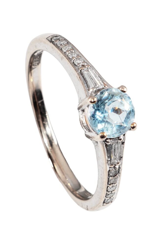 Besides the pendant, the aquamarine ring is definitely the best choice to wear this gemstone. There are rarely small stones in the rings with aquamarine. Larger examples are usually cut in emerald (staircase cut). They can be worn either on the middle finger or on the ring finger as a cocktail ring. Fantastic are also the noble creations with central aquamarines in oval cut or brilliant facet cut. In these cuts they always correspond with diamonds / brilliants. The designs are breathtaking throughout! In Art déco, goldsmiths and platinum smiths took it to the extreme and integrated perfectly cut, eye-pure aquamarines into exuberantly luxurious and imaginative rings. We already had rings in our assortment, where besides diamonds also sapphires accompanied an aquamarine. Beautiful creations to kneel down were in fact also created after the end of the Art Deco era in the peaceful western world, from about 1950. Even in the vintage era the stone remained popular. Our range of rings and engagement rings with aquamarine goes back to the late 1970s. Round, oval and rectangular ring heads with the stone combination aquamarine and diamond were available in various sizes and designs. Like diamond rings and other colored stones, aquamarines were set in platinum settings in the 20th century. The desired color character silver guarantees an unadulterated color fidelity of the gemstones.