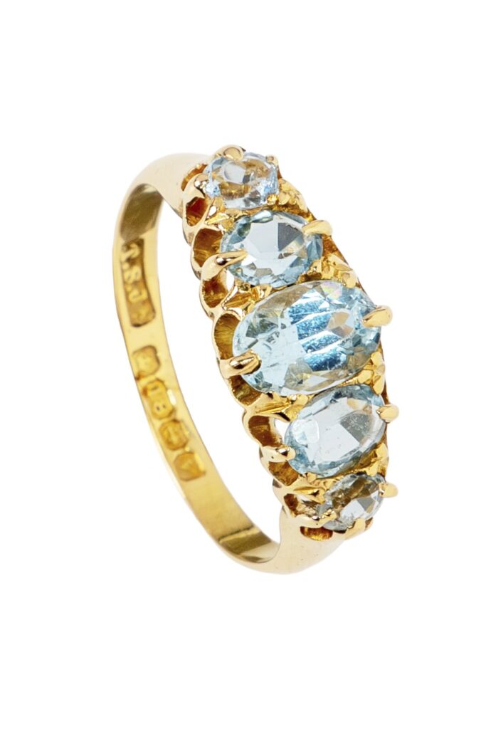 Already centuries ago these precious stones were worked into amulets. Sailors wore them as lucky charms on a necklace during their voyages. They were often thrown overboard before or during a storm to appease the sea god Poseidon. For the most part, it must have worked well, because this custom was maintained over many generations. In modern times the use of aquamarines is of course of a different nature. Eye-clean specimens are very popular and usually act as the center of exciting jewellery creations. They are accompanied either by diamonds or light pearls. Only very rarely are they part of multicolor jewellery from the vintage era, such as a bracelet or necklace without a pendant. Antique jewelry with aquamarine stone almost always refers to rings, earrings and exciting necklaces. Before platinum could be processed well from about 1900 onwards, goldsmiths and silversmiths emphasized the gentle blue of the aquamarine with settings of sterling silver (925 silver). Antique aquamarine jewellery was usually made of at least 14 carat (585) gold, but mostly 18 carat (750) gold. Discover our jewellery of this kind in the assortment – Buy antique jewellery securely online. Fascinating individual pieces are for example: