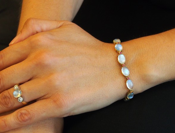 Moonstones are very earthly! The extremely popular gemstones got their name because of its obvious characteristics. The most intriguing is the inherent shimmer, reminiscent of the diffuse light of the moon in the night sky. Moonstones have a creamy white, sometimes ivory to bluish color character and are milky-transparent. From the optical properties inevitably one draws parallels to opals. In fact, these two gemstones have much in common. Both gems are used exclusively for jewellery making – what makes us very happy! One falls in love and dreams in them and life seems to gain in lightness.