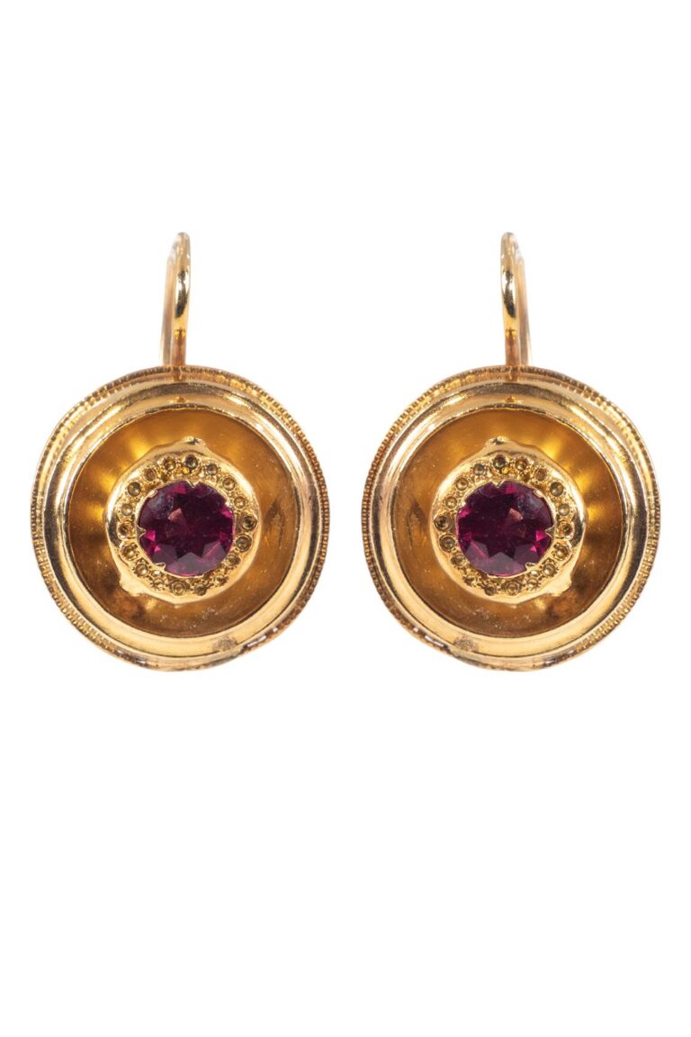 - Earrings and stud earrings with garnet or the variety almandine, settings mostly of tombac, with the coveted colour character of yellow gold.