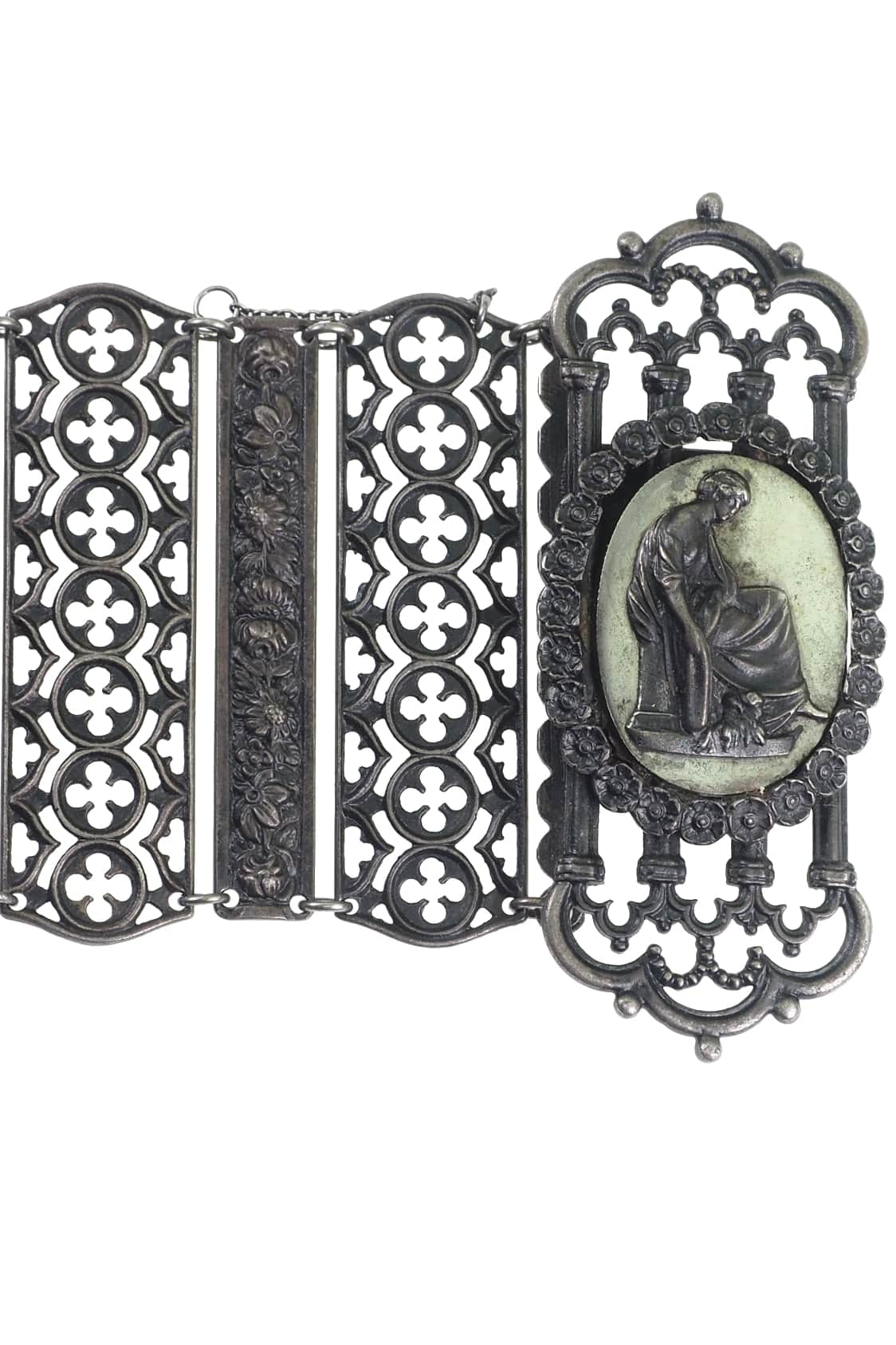 Neogotisches Design mit einem Flachrelief auf polierter Stahlplatte. Das Motiv stellt eine allegorische Figur dar.