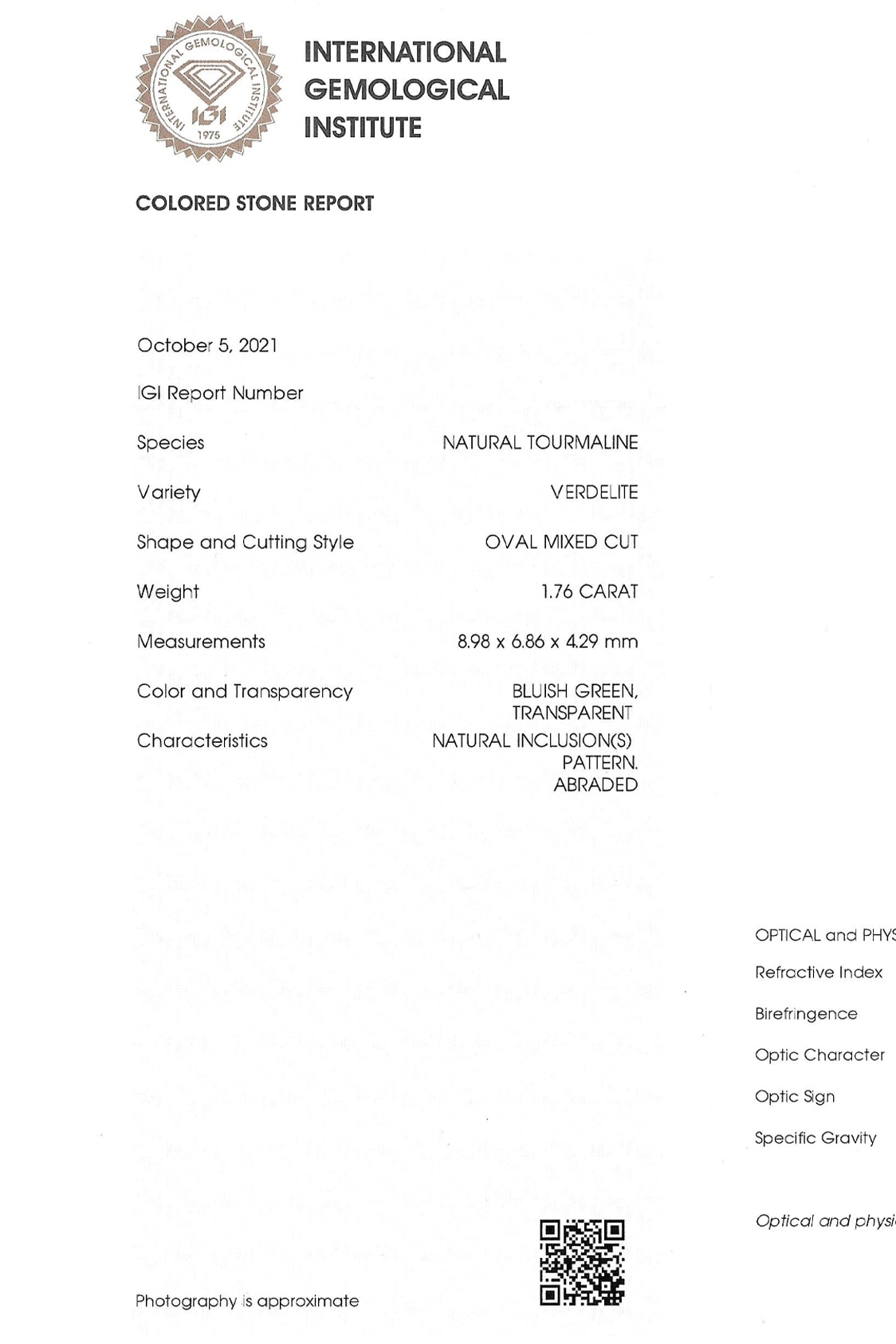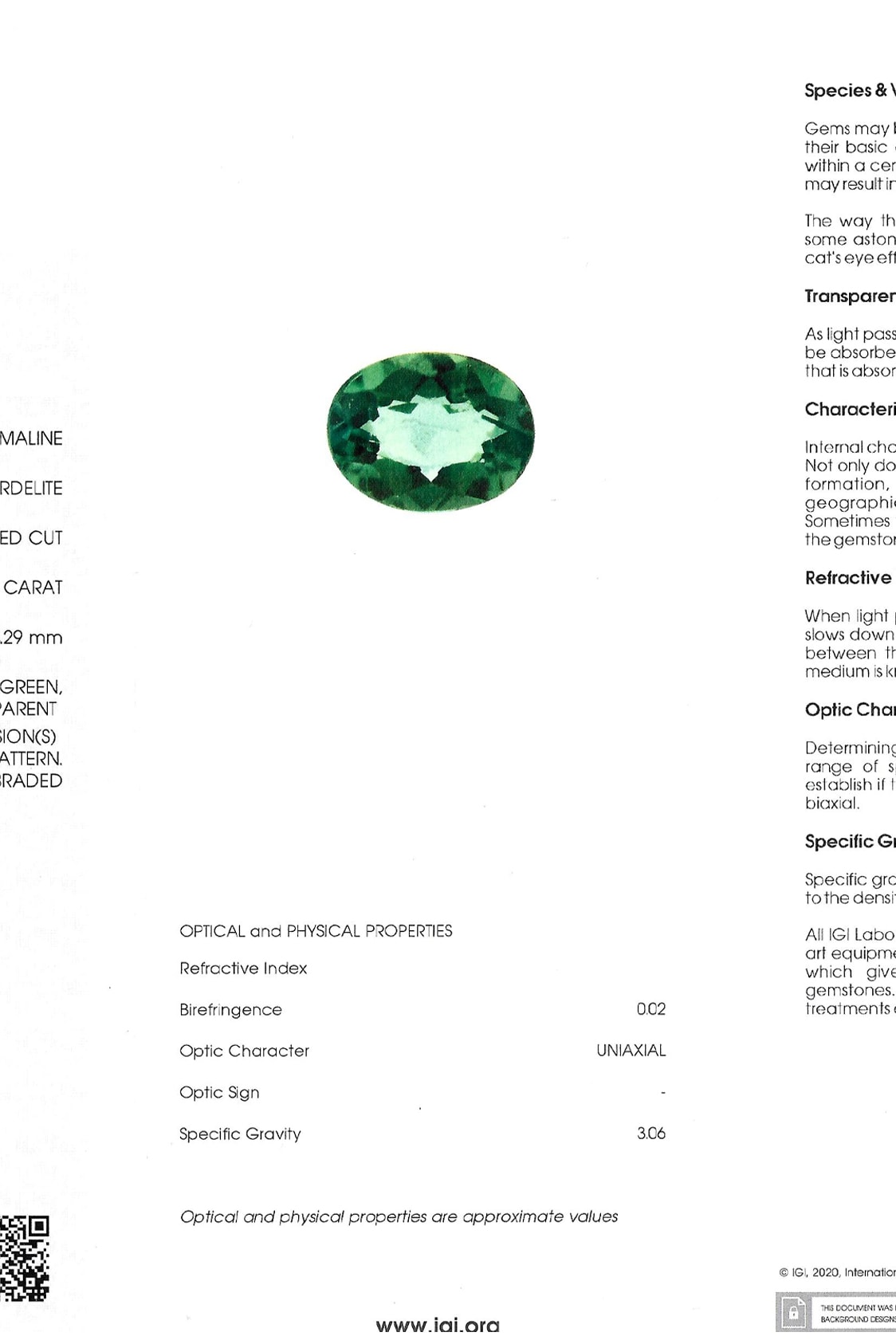 Ein gemmologisches Gutachten über den Turmalin liegt vor und wird beim Kauf überreicht. Der Turmalin ist folgendermaßen bewertet: