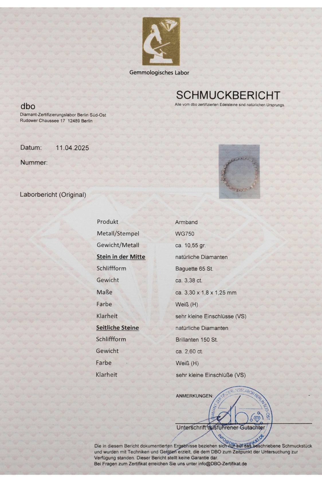 Ein gemmologisches Zertifikat über die natürlichen Diamanten liegt vor und wird beim Kauf überreicht.