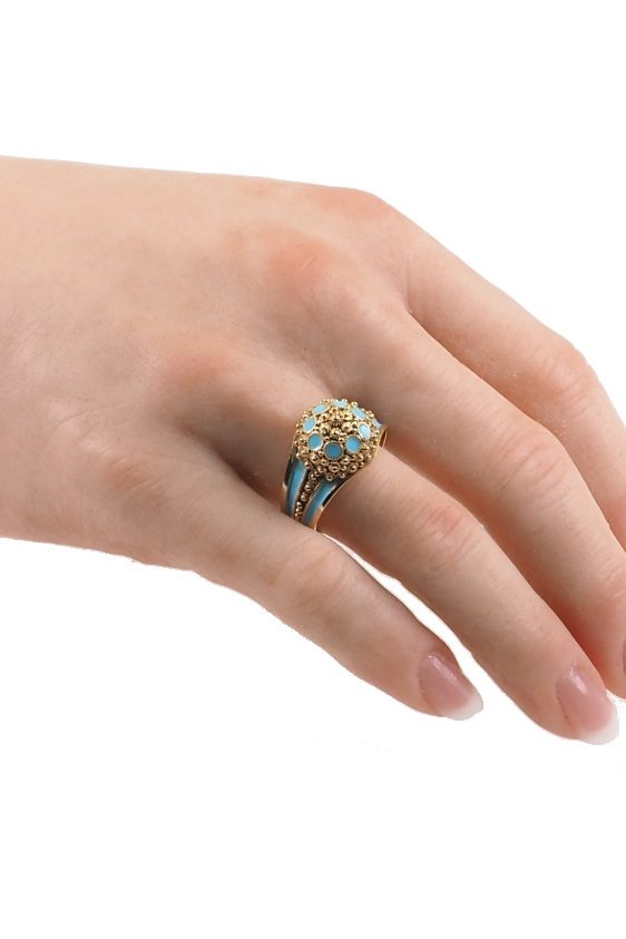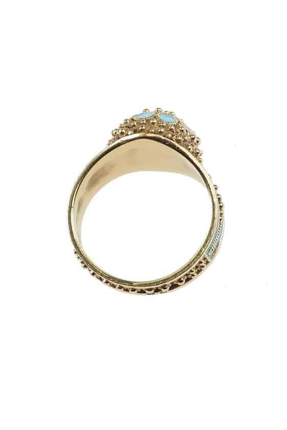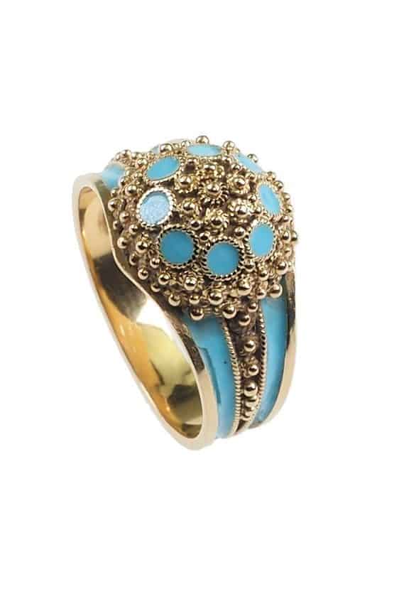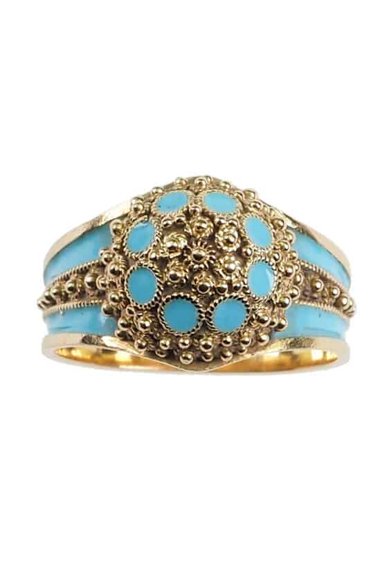 Um 1960 – 18 ct. Goldring mit hellblauer Emaillearbeit & Granulationsdekor
