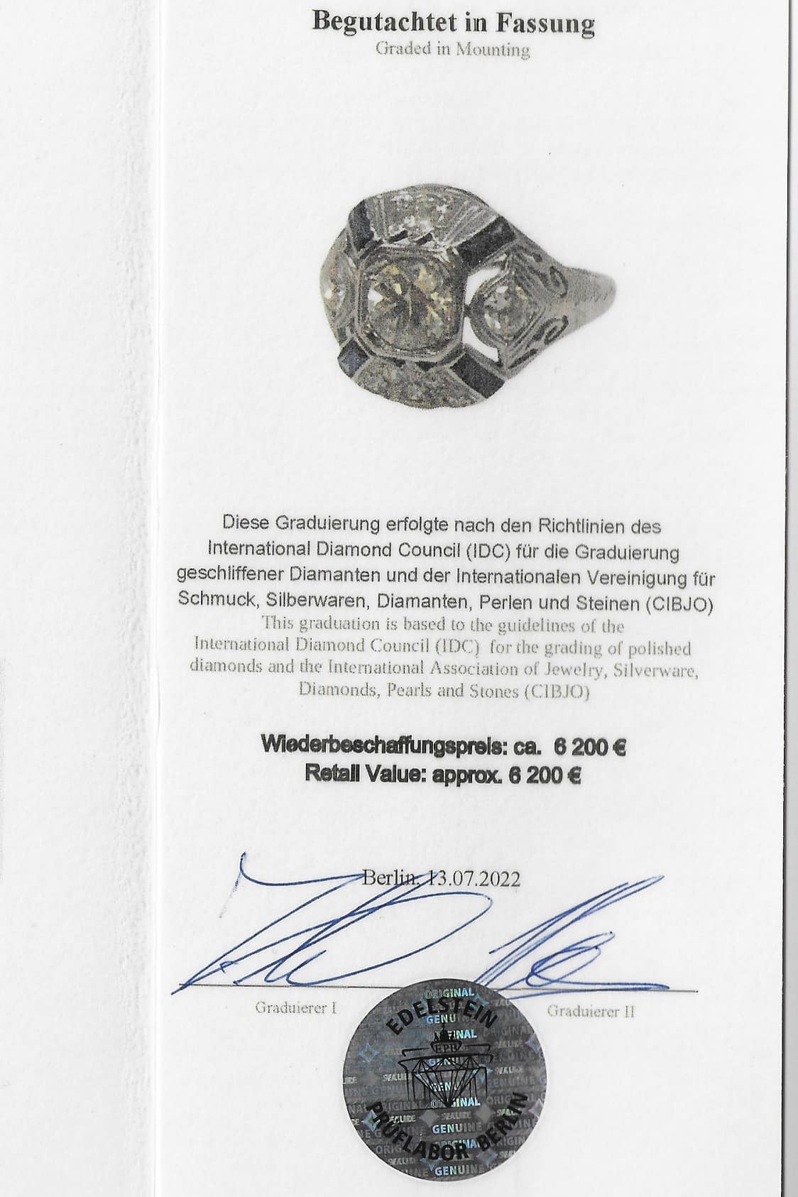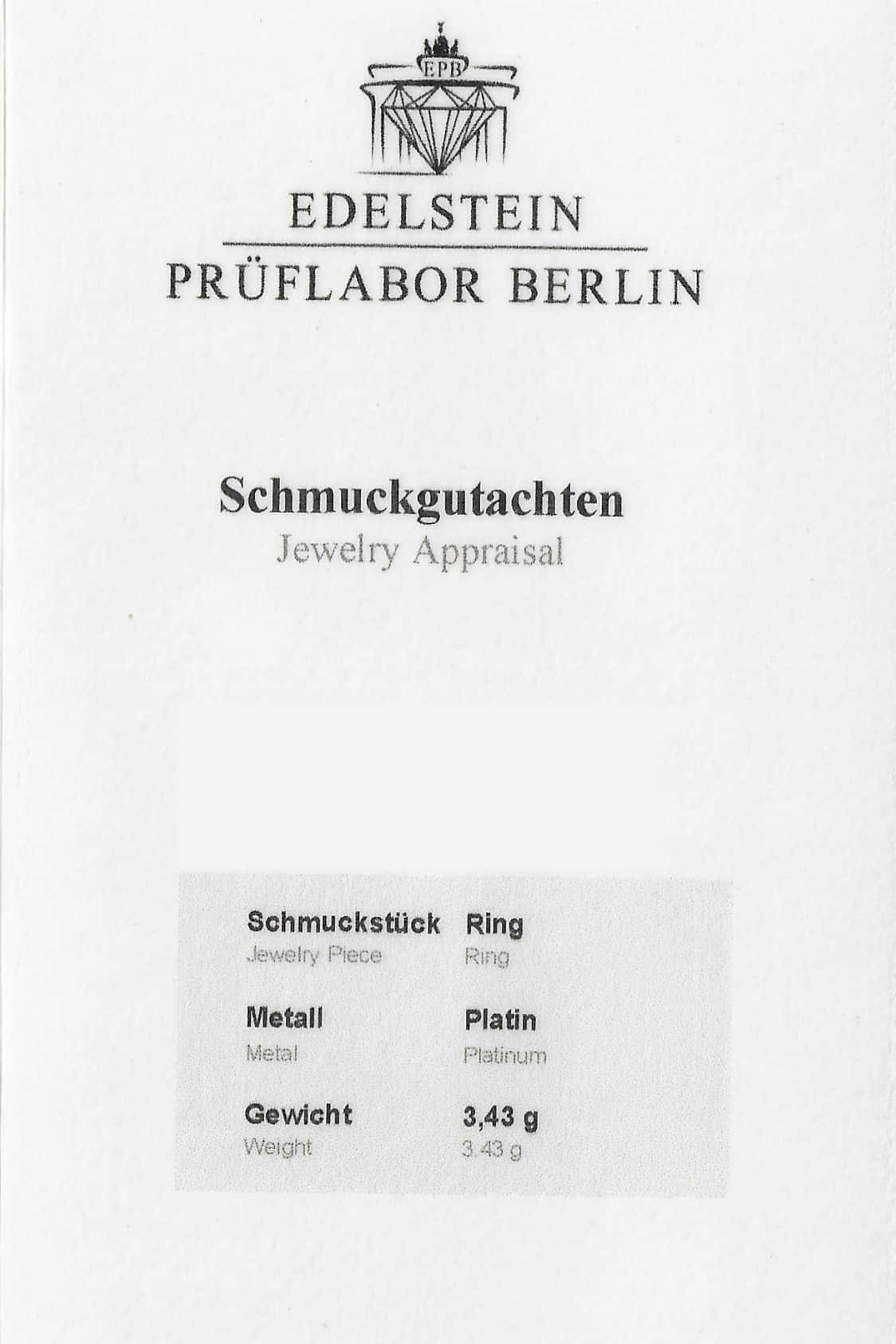 Ein gemmologisches Zertifikat über die Edelsteine liegt vor und wird beim Kauf überreicht. Die Edelsteine sind folgendermaßen bewertet: