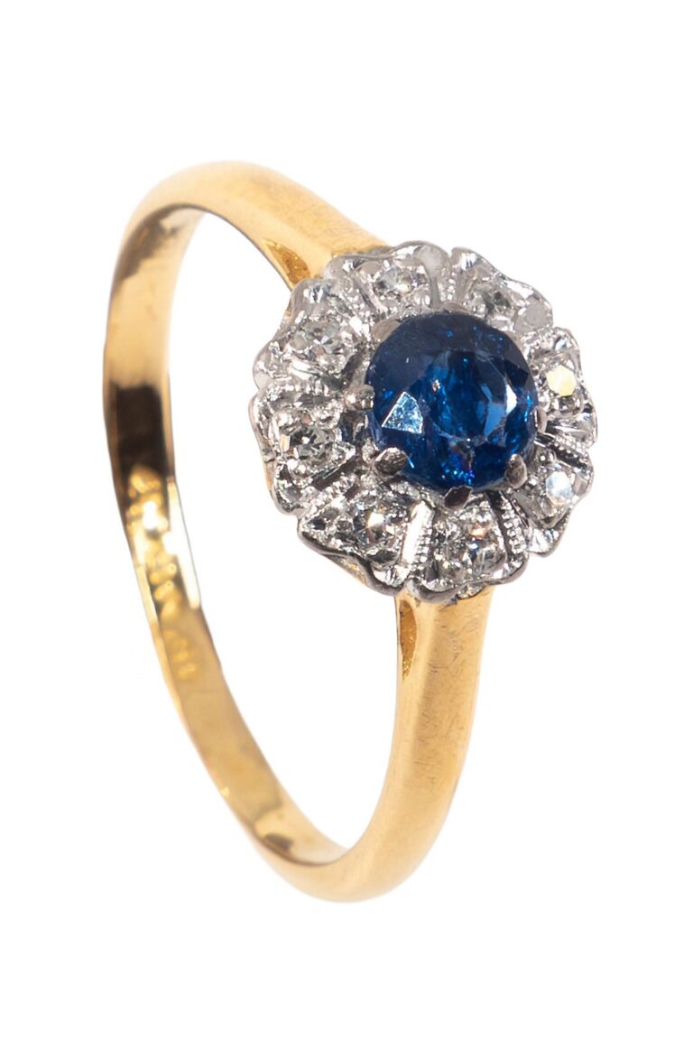 Eine lebendige Farbe wie Blau wird im Schmuck gern verwendet. Hier ist der Saphir dem Aquamarin von der Bandbreite seiner Farben weit überlegen. Man kann diese beiden Edelsteine eigentlich nicht so richtig vergleichen. Der sehr hell himmelblaue bis wässrig anmutende Aquamarin wird aufgrund seiner oft sehr großen Steine, in perfekter augenklarer Qualität, ganz anders inszeniert als der Saphir. Zwar sind die helleren Saphire mit Tendenz zu grün-blau und violett-blau auch meist augenklar, aber deutlich kleiner. Diese Saphire sind in natürlicher Form äußerst rar und kostenintensiv. Ringe mit solchen Saphiren setzen höchste Materialqualität an Gold, Platin und begleitende Brillanten voraus. Es sind luxuriöse Schmuckstücke, die auf verblüffende Perfektion im Detail ausgelegt sind. Dennoch steht der dunkelblaue Saphir in der Gunst der Schmuckliebhaber, vor allem bei antikem Schmuck, an oberster Stelle. Der dunkle Saphir soll sich deutlich unverwechselbar abgrenzen. Hellere Steine könnten auch Turmaline oder Tansanite sein. Ein natürlicher Saphir von intensivem Blau macht am Finger einfach eine gute Figur. Für Herren hat Antikschmuck leider nur selten einen Ring mit Saphir im Angebot. Für Damen umso häufiger – aus allen relevanten Schmuckepochen. Die perfekten Facettenschliffe, ab etwa 1910, ermöglichten es den Juwelieren, ihre Leidenschaft für blaue Saphire in Ringen voll auszuleben. Grandios!