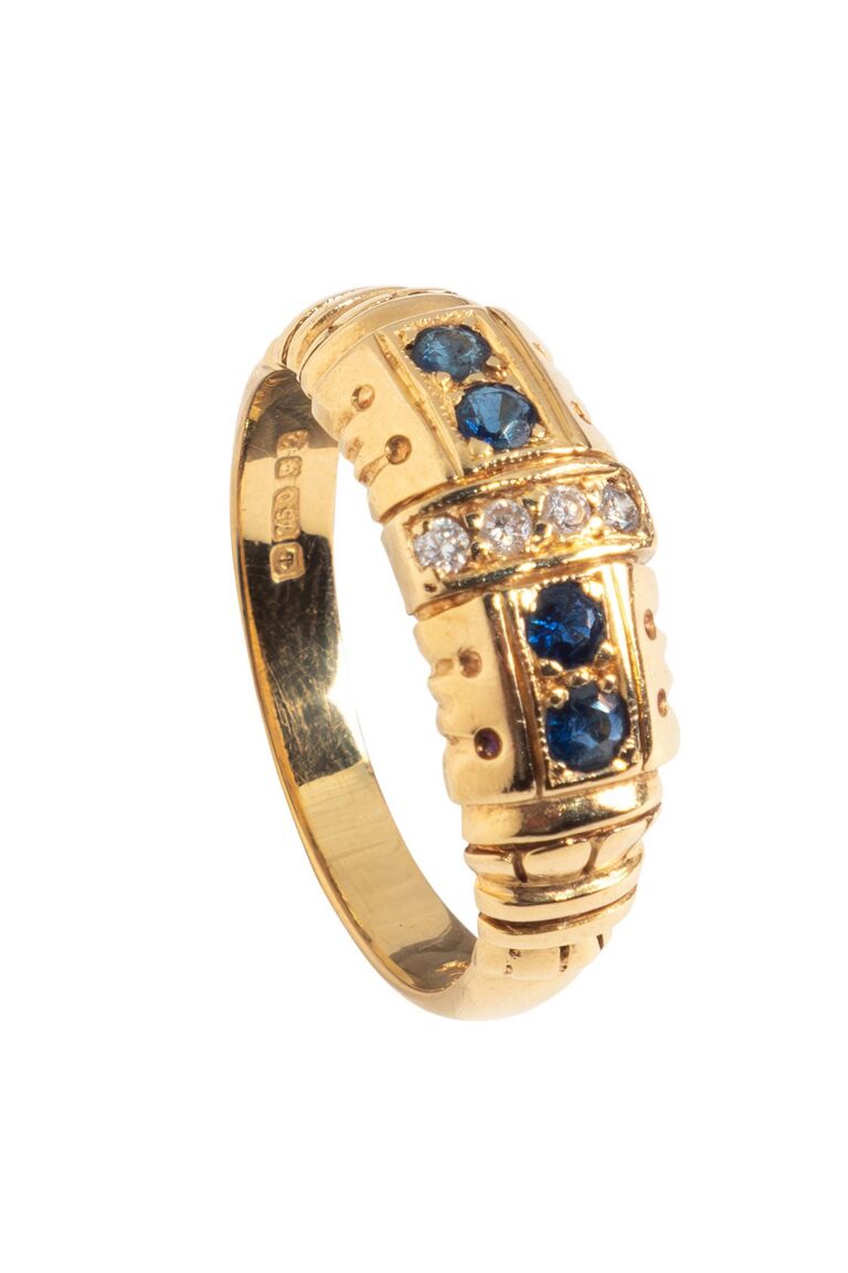 - Ringe mit dem Geburtsstein Saphir, teilweise als Three-Stones/Five-Stones Ring mit abwechselnd Diamanten/Brillanten → populär durchgehend bis in die Vintage-Zeit,