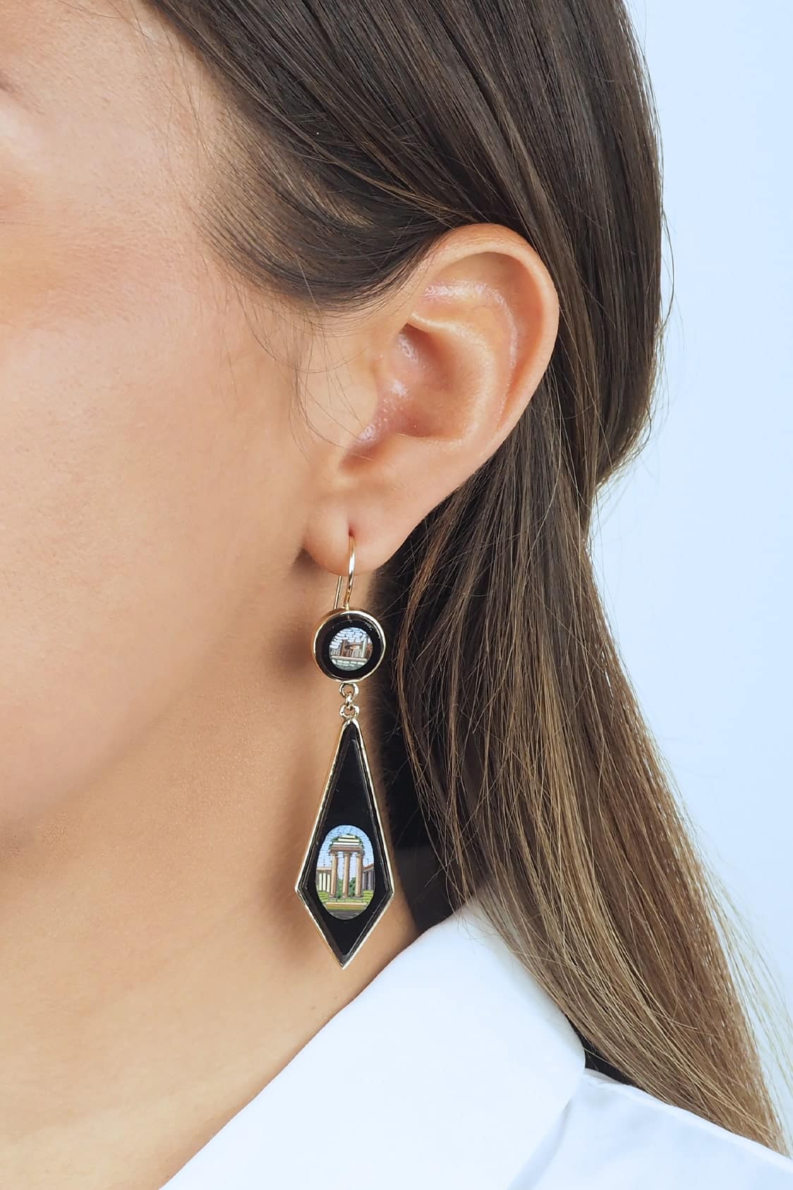 Home » Shop » Um 1870 – Mikromosaik-Ohrringe mit Goldfassungen, Darstellungen antiker römischer Gebäude