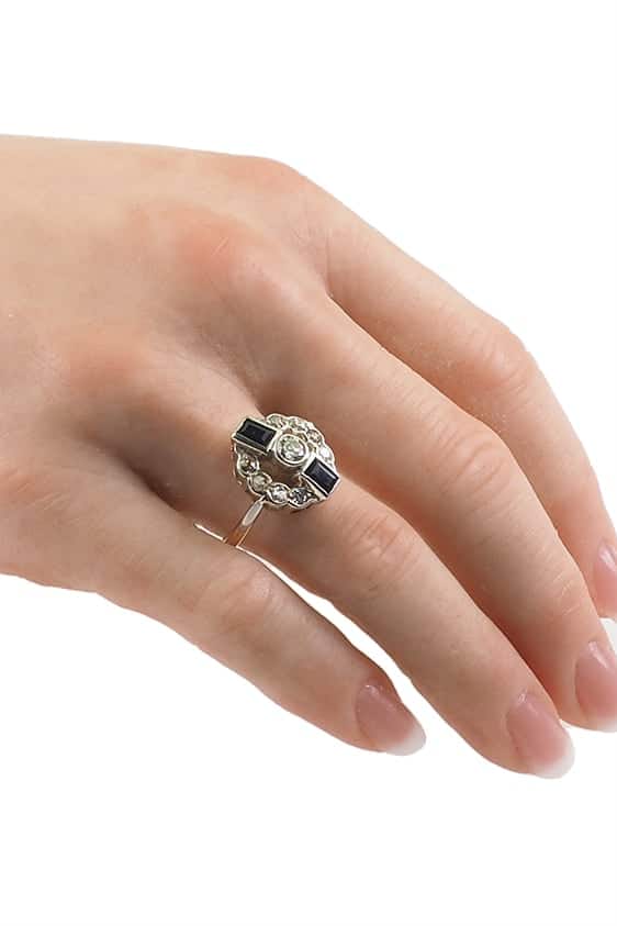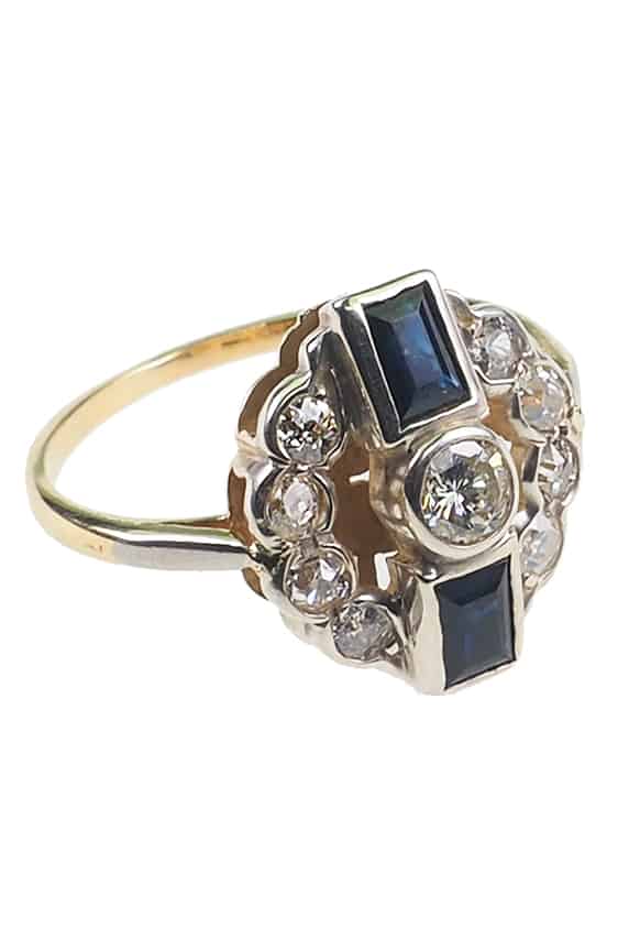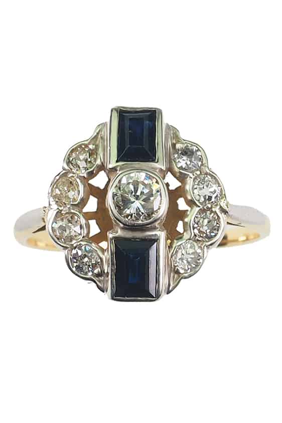 Home » Shop » Um 1930 – Englischer Art déco Ring aus 18 ct. Gold, mit zwei Saphiren und neun Diamanten