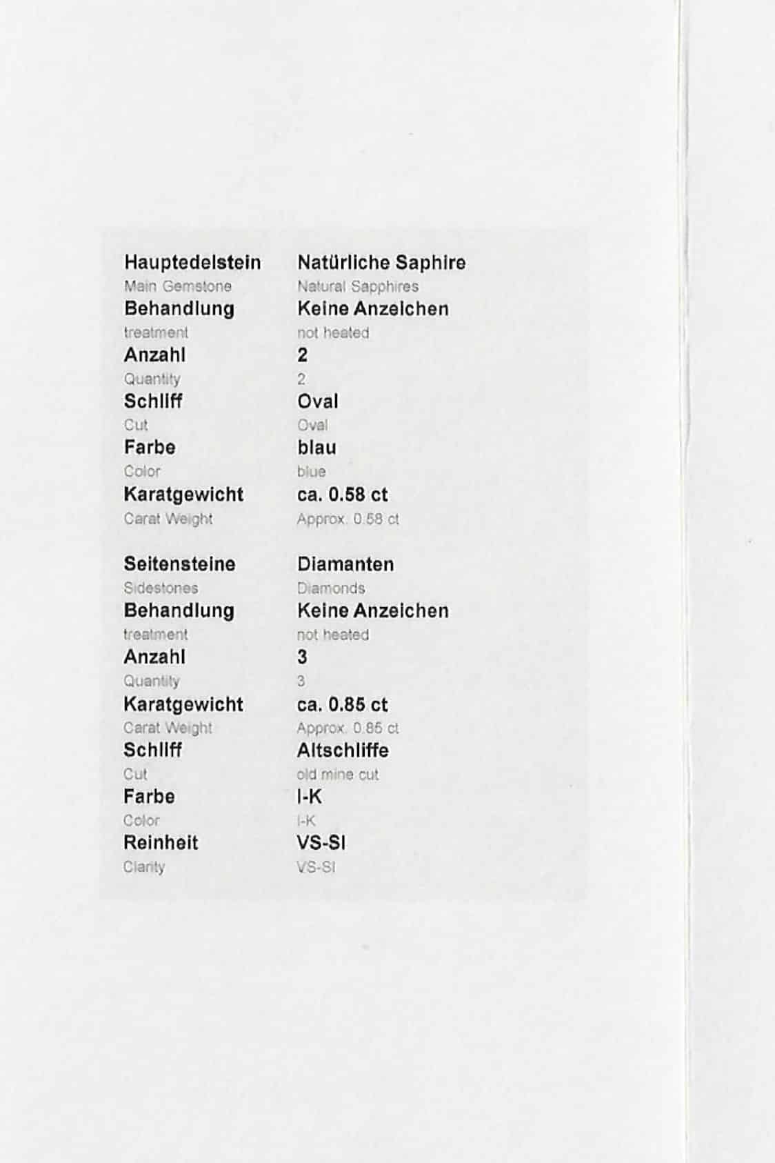 Ein gemmologisches Zertifikat über die Edelsteine liegt vor und wird beim Kauf überreicht. Die Edelsteine sind folgendermaßen bewertet: