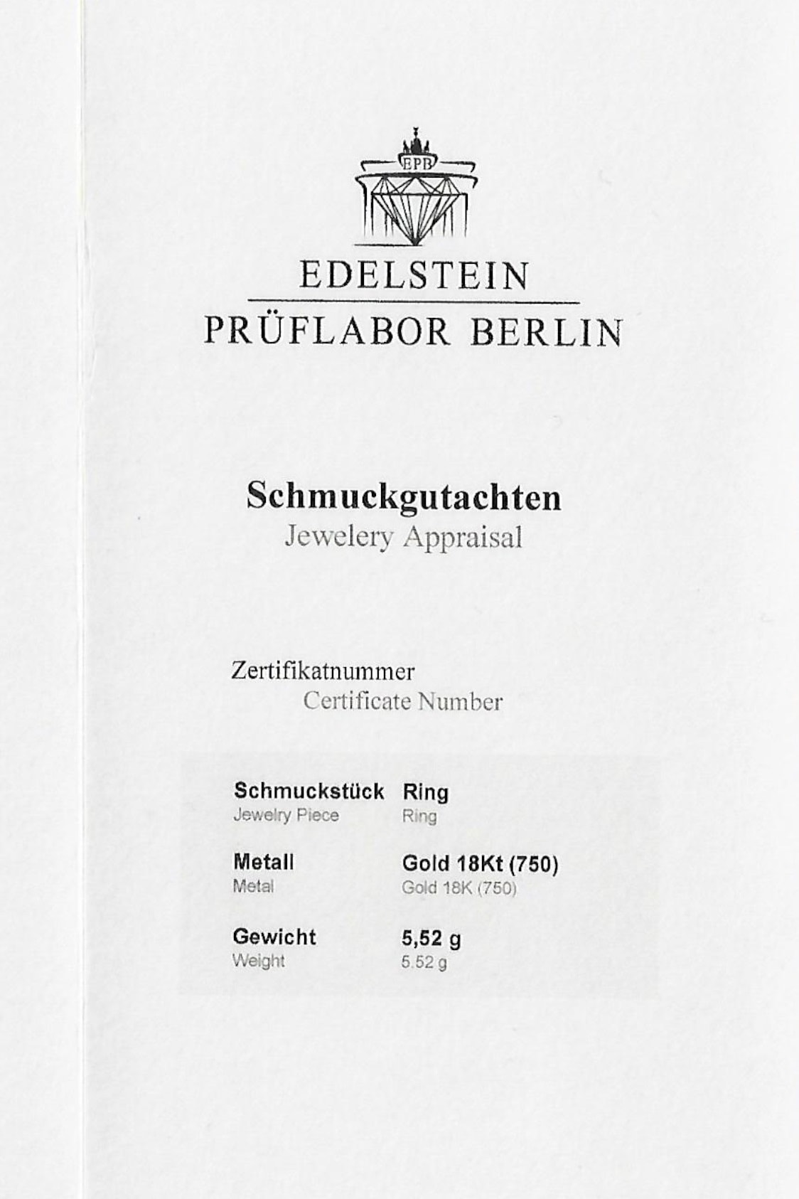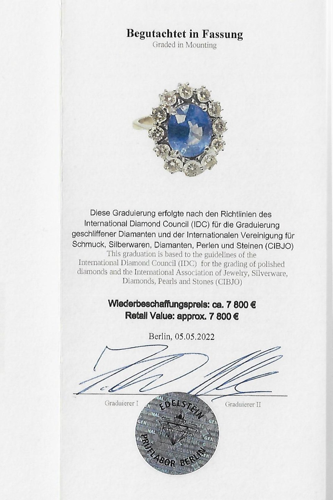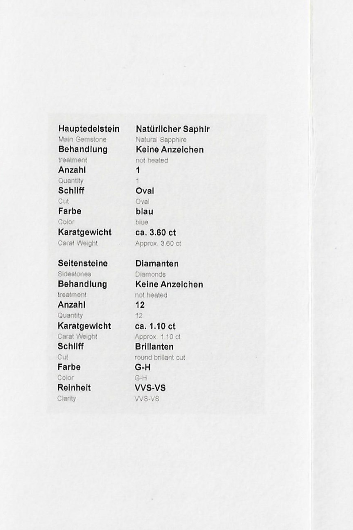 Ein gemmologisches Zertifikat über die Edelsteine liegt vor und wird beim Kauf überreicht. Die Edelsteine sind folgendermaßen bewertet: